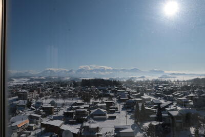 十勝岳連峰と美瑛町 四季の塔から見た美瑛高校校舎