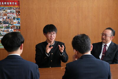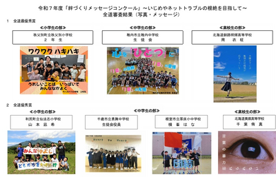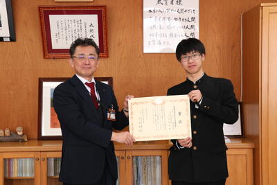 2月19日(木)昼休み、校長室にて「絆づくりメッセージコンクール・写真部門」全道の賞状伝達式がありました。3年生千葉侑真君が、昨年に続き2年連続優秀賞を受けました。北海道教育庁上川教育局長今村隆之氏より、賞状が渡されました。その後局長より、作品制作の意図や工夫について質問され答えていました。瞳の中に文字をどのように入れたのかについてはタブレットで文字を作成し、反転させて瞳の中央に入れるために、モデルの部員の協力が不可欠だったと説明していました。