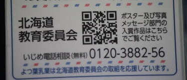 昨年同様、よつ葉乳業株式会社様の牛乳「軽やかしぼり」のパッケージにことば・メッセージ部門の作品が印字されています。写真部門はQRコードから北海道教育委員会のページに入ると見られますので是非ご覧ください。